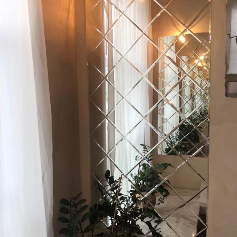 Для украшения использовалась зеркальная плитка формы вытянутый ромб серебряного цвета.